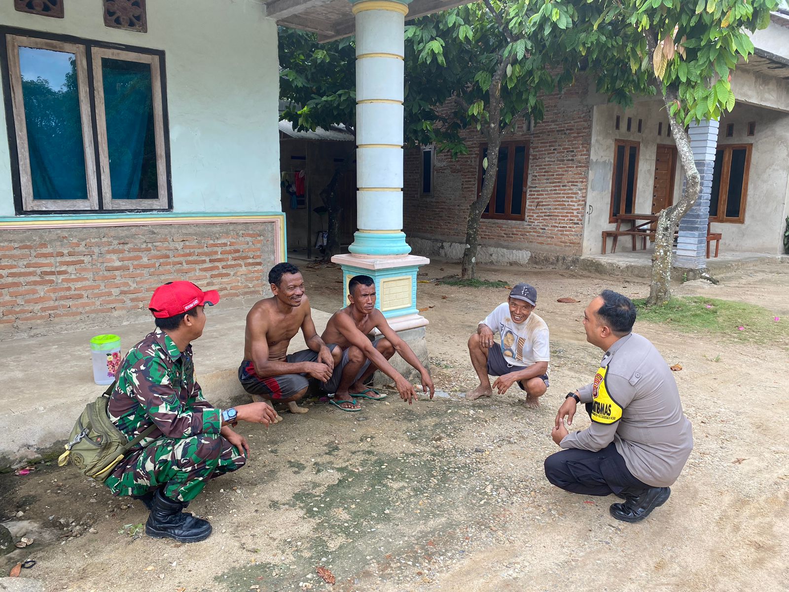 Aipda Daniel, Bhabinkamtibmas Polsek Jati Agung, terlihat sedang duduk jongkok santai di depan rumah warga bersama seorang sopir truk yang tengah beristirahat.