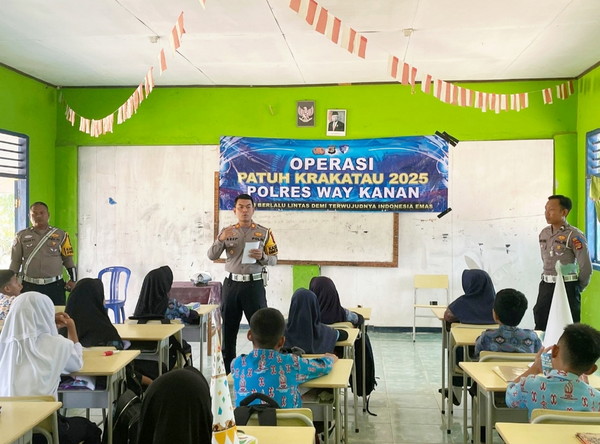 tribratanews.lampung.polri.go.id. Kasatlantas Polres Way Kanan AKP Asep Suhendi hadir langsung pada kegiatan police goes to school dalam rangka Operasi Patuh Krakatau 2025 di SMPN 5 Blambangan Umpu. Kamis (17/07/2025).Tujuannya guna mengedukasi tertib berlalu lintas dan mencegah kecelakaan lalu lintas sejak dini. Kegiatan yang mengusung tema "Tertib Berlalulintas Demi Terwujudnya Indonesia Emas", ini menjadi langkah awal dalam upaya meningkatkan kepatuhan adik - adik pelajar terhadap aturan lalu lintas, sekaligus meminimalisir angka pelanggaran dan kecelakaan diwilayah hukum Polres Way Kanan.