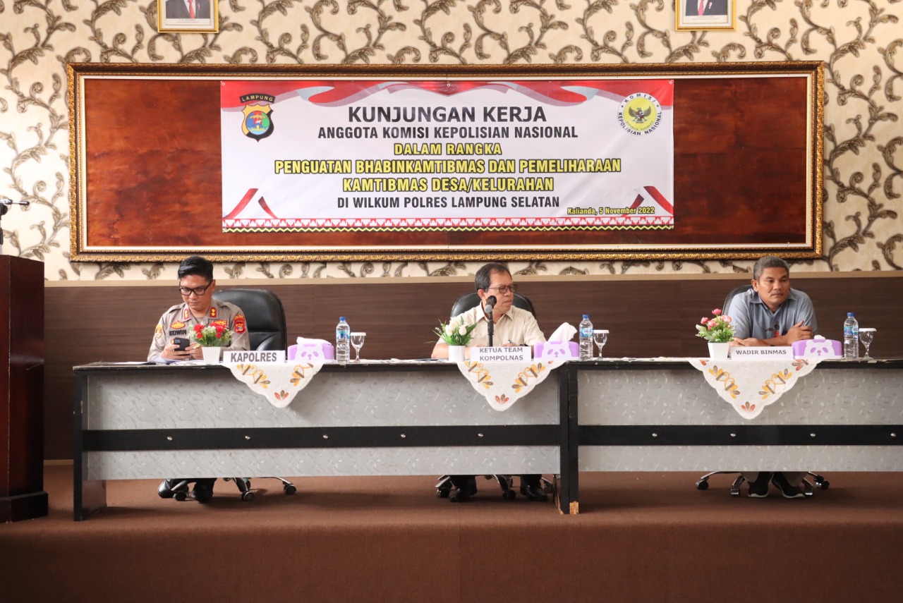 Kunjungan kerja Komisi Kepolisian Nasional Indonesia (Kompolnas) ini dilakukan berkenaan dalam rangka penguatan Bhabinkamtibmas dan pemeliharaan kamtibmas tingkat desa/kelurahan khususnya melingkupi di Wilayah hukum Polres Lampung Selatan.