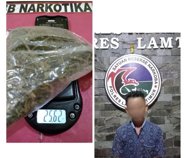 https://tribratanews.lampung.polri.go.id. Lampung Timur - Sat Res Narkoba - Polres Lampung Timur - Polda Lampung telah mengamankan seorang, diduga melakukan tindak pidana penyalah gunaan dan peredaran Narkotika.Pelaku dengan sengaja melakukan penyalah gunaan dan peredaran Narkotika golongan 1 jenis ganja. Kapolres Lampung timur AKBP M Rizal Muchtar didampingi Kasat Narkoba Iptu Riki Setiawan pada Jum'at (28/6/24) menjelaskan bahwa Inisial GM (51) warga Kecamatan Way Bungur Kabupaten Lampung Timur. Pada hari Kamis (27/6/24) sekira pukul 23.30 wib, Sat Res Narkoba Polres Lampung Timur telah melakukan penangkapan terhadap seorang laki-laki GM (51) di desa Tanjung Tirto Kecamatan Way Bungur kabupaten Lampung Timur. Pada saat dilakukan penggeledahan badan serta tempat ditemukan barang bukti berupa 1 (satu) bungkus plastik yang berisi bahan daun kering, batang dan biji narkotika golongan I dalam bentuk tanaman jenis ganja. Bruto 25,62 Gram. Tersangka dan barang bukti selanjutnya dibawa ke Mapolres Lampung Timur untuk dilakukan proses hukum lebih lanjut, Terkait dugaan tindak pidana yang dilakukannya. Tersangka dijerat dengan pasal 114 Jo pasal 112 UU RI No. 35 Tahun 2009 tentang Narkotika.