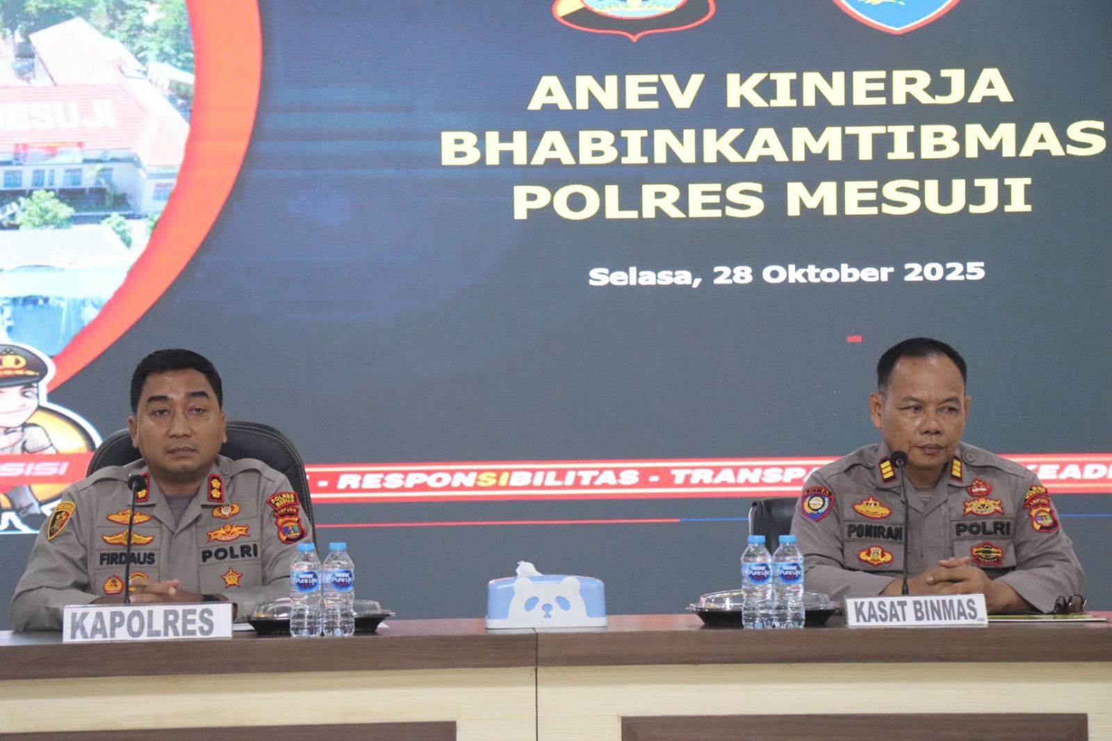 tribratanews.lampung.polri.go.id. Mesuji, Rabu 29 Oktober 2025 - Polres Mesuji menggelar kegiatan Analisa dan Evaluasi (Anev) kinerja Bhabinkamtibmas jajaran Polres Mesuji. Kegiatan ini dilaksanakan di Aula Tri Brata Endra Dharma Laksana dan dipimpin langsung oleh Kapolres Mesuji AKBP Dr. Muhammad Firdaus S.Ik, M.H. Selasa (28/10/2025)Dalam arahannya, AKBP Firdaus menyampaikan apresiasi kepada para Bhabinkamtibmas yang telah melaksanakan tugas dengan baik dan berdedikasi tinggi dalam menjaga keamanan dan ketertiban masyarakat di wilayah binaannya masing-masing.
