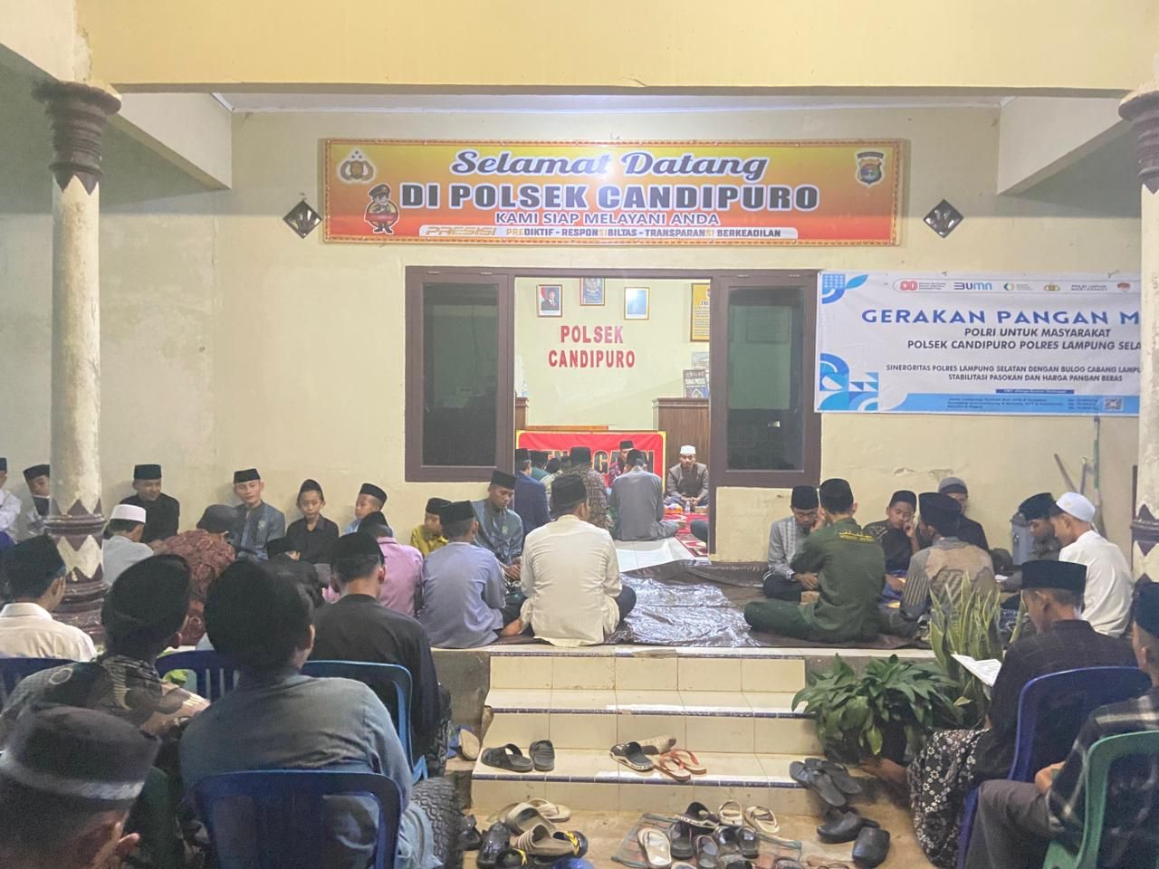 tribratanews.lampung.polri.go.id Lampung Selatan Sabtu 30 Agustus 2025, – Polsek Candipuro, Polres Lampung Selatan, menggelar doa bersama dan santunan anak yatim dalam rangka menjaga kondusifitas kamtibmas di wilayah hukumnya. Kegiatan ini berlangsung di Mapolsek Candipuro pada Jumat malam (29/8/2025), dihadiri sekitar 150 jamaah dari kalangan tokoh agama, tokoh masyarakat, tokoh pemuda, serta warga setempat.