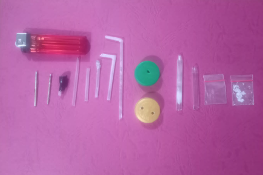 - bungkus plastik bening berisikan kristal warna putih bekas pakai, 2 (dua) buah pipa kaca / pirek, 2 (dua) buah tutup botol plastik yg sudah dilubangi, 6 (enam) buah pipet plastik yg sudah dimodifikasi,