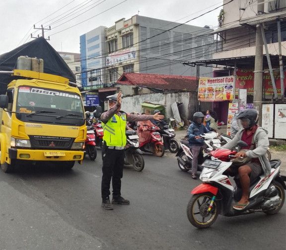 Dalam pelaksanaannya, petugas melakukan pengaturan lalu lintas untuk memastikan kelancaran arus kendaraan serta mencegah terjadinya kemacetan di kawasan simpang yang rawan kepadatan.