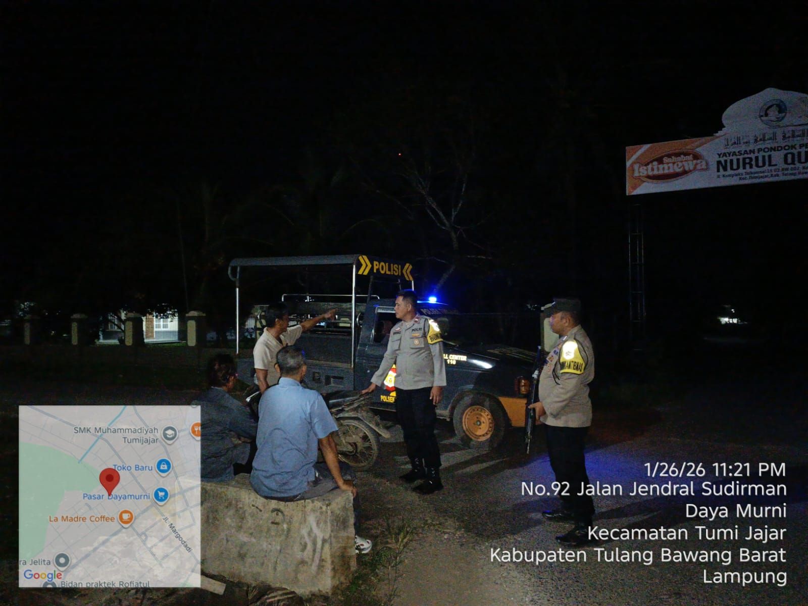 tribratanews.lampung.polri.go.id. Tulang Bawang Barat, Rabu 28 Januari 2026 Personel Polsek Tumijajar, Polres Tulang Bawang Barat, telah melaksanakan kegiatan pembinaan dan penyuluhan (Binluh) dialogis kepada masyarakat pada Selasa malam, 27 Januari 2026, pukul 23.20 WIB hingga selesai, bertempat di Kelurahan Daya Murni, Kecamatan Tumijajar, Kabupaten Tulang Bawang Barat.Dalam kegiatan tersebut, personel Polsek Tumijajar menyampaikan pesan-pesan kamtibmas kepada masyarakat guna meningkatkan kewaspadaan terhadap potensi gangguan keamanan dan ketertiban. Masyarakat dihimbau untuk selalu waspada terhadap aksi tindak pidana 3C (Curat, Curas, dan Curanmor) yang rawan terjadi, khususnya di area parkiran, dengan cara mengunci stang serta menambahkan kunci pengaman tambahan baik pada siang maupun malam hari. Selain itu, personel juga mengingatkan masyarakat agar lebih berhati-hati saat berkendara, terutama melintasi jalanan yang sepi, tidak berkendara sendirian, serta tidak meletakkan barang berharga di dasbor kendaraan guna mengantisipasi tindak pidana curas dan kejahatan jalanan lainnya. Masyarakat juga dihimbau untuk memastikan pintu dan jendela rumah dalam keadaan terkunci saat meninggalkan rumah maupun saat beristirahat, sebagai upaya pencegahan tindak pidana curat.