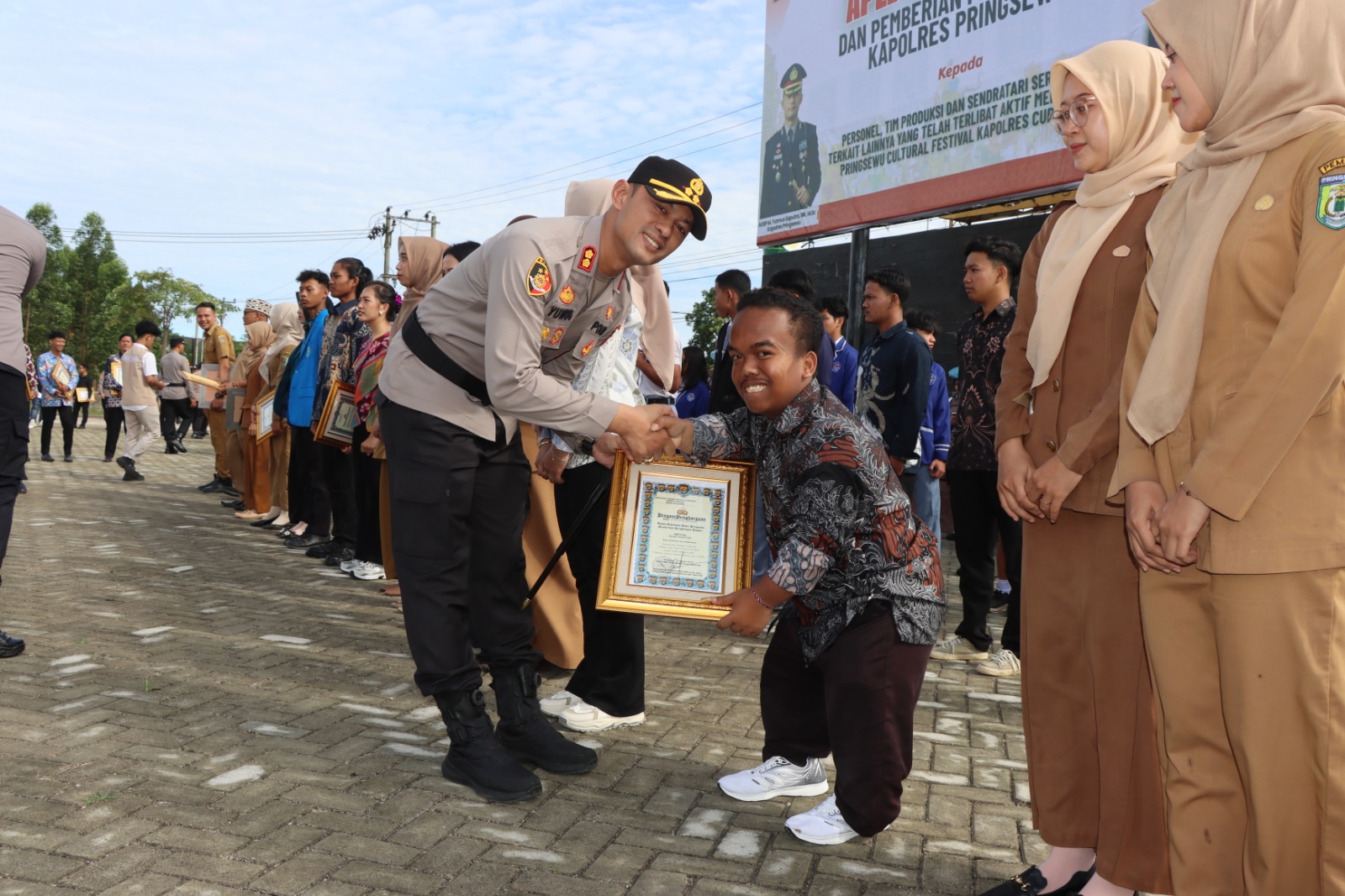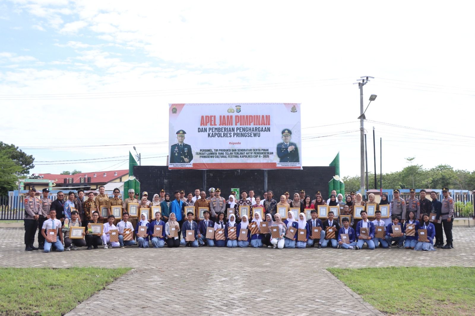tribratanews.lampung.polri.go.id. Pringsewu, Senin 27 Oktober 2025 – Kapolres Pringsewu AKBP M. Yunnus Saputra memberikan penghargaan kepada 91 individu yang telah berkontribusi dalam menyukseskan Pringsewu Cultural Festival dan Kapolres Cup II Tahun 2025. Penghargaan tersebut diberikan dalam apel pagi jam pimpinan yang berlangsung di halaman Mapolres Pringsewu pada Senin (27/10/2025).Penghargaan ini diberikan sebagai bentuk apresiasi atas dedikasi, kerja keras, serta kolaborasi seluruh pihak selama pelaksanaan kegiatan budaya yang digelar selama tiga hari, yakni pada 15 hingga 17 Oktober 2025. Acara tersebut berlangsung meriah, aman, dan sukses menarik perhatian masyarakat sekaligus menjadi ajang pelestarian seni budaya lokal. Penerima penghargaan terdiri dari, 4 personel Polri, 84 tim produksi dan seniman sendratari Hikayat Sang Timur, Jatmara Sai Bumi serta 3 pemenang lomba konten kreatif. Kapolres Pringsewu AKBP M. Yunnus Saputra menyampaikan apresiasi kepada seluruh pihak yang telah berkontribusi dalam menyukseskan Pringsewu Cultural Festival dan Kapolres Cup II Tahun 2025. Ia menegaskan bahwa keberhasilan kegiatan ini tidak lepas dari peran aktif anggota kepolisian, tim produksi, seniman sendratari, serta masyarakat yang terlibat selama pelaksanaan acara.