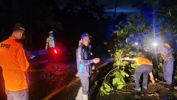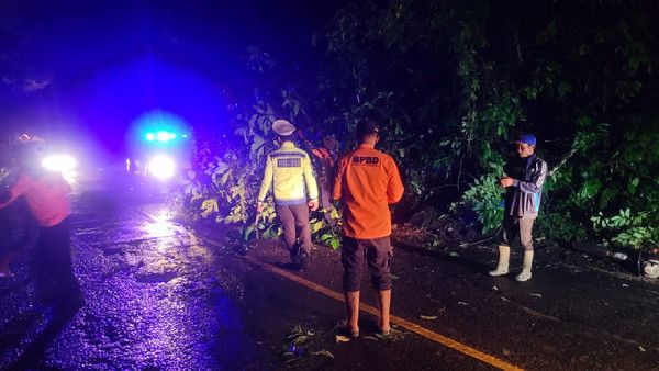 tribratanews.lampung.polri.go.id. Tanggamus, Jumat 13 Pebruari 2026 – Satuan Lalu Lintas (Sat Lantas) Polres Tanggamus bersama Dinas Pemadam Kebakaran dan Penyelamatan (Damkarmat), BPBD serta Dishub Tanggamus bergerak cepat menangani pohon tumbang disertai material tanah longsor yang menutup Jalan Raya Pekon Batu Keramat, Kecamatan Kota Agung Timur, Kabupaten Tanggamus, Rabu (11/2/2026) petang.Kasat Lantas Polres Tanggamus, AKP Rudi Khisbiyantoro, S.Pd., M.H., mengatakan, peristiwa tersebut terjadi sekitar pukul 18.30 WIB, setelah wilayah setempat diguyur hujan dengan intensitas cukup tinggi.