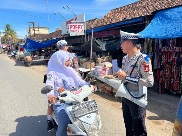 tribratanews.lampung.polri.go.id. Pringsewu, Rabu 16 Juli 2025 – Dalam rangka mendukung pelaksanaan Operasi Patuh Krakatau 2025, Satuan Tugas Preemtif Polres Pringsewu menggelar kegiatan sosialisasi dan edukasi tertib berlalu lintas di kawasan Pasar Ambarawa, Kabupaten Pringsewu, pada Rabu (16/7/2025).Kegiatan ini menyasar langsung masyarakat dengan pendekatan tatap muka, di mana petugas memberikan penyuluhan kepada para pengunjung pasar mengenai pentingnya mematuhi peraturan lalu lintas. Selain itu, polisi juga membagikan leaflet berisi informasi seputar keselamatan berlalu lintas.