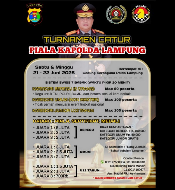 Turnamen Catur Piala Kapolda Lampung Mulai Dibuka Pendaftaran Hari Ini